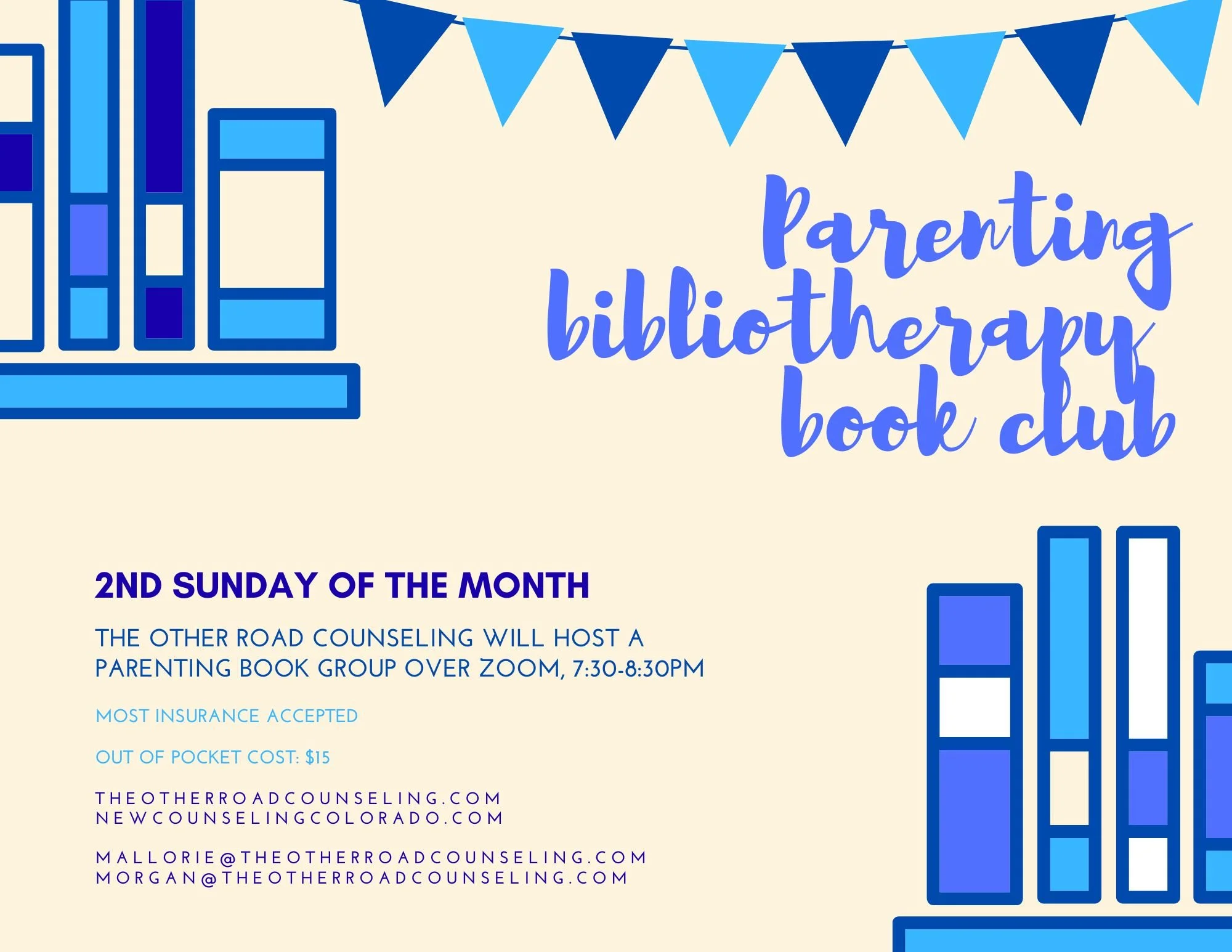 The Other Road Counseling will be hosting a virtual parenting book group on the second Sunday of the month beginning over Zoom at 7:30pm. Bibliotherapy is a creative arts therapy centered around the use of books as being learning tools or relational sources, aiding in the understanding and processing of mental health and personal growth concepts. The books we read will center themes of raising children, parental needs and mental health, family undertanding and support, and more.